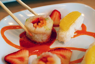 As an appetizer, Our Ladies enjoyed some of Orange’s signature Frushi (fruit + sushi). They were each presented with 2 pieces: a strawberry and cantaloupe “maki” and an orange and coconut rice "nigiri.” Though thoroughly delightful and delicious, Our Ladies did find the treats a tad difficult to eat with the chopsticks provided. (Truth be told, this so called appetizer didn't make it to the table until after the main courses had been presented, and even then only after Bunny pointed out it had yet to arrive.)