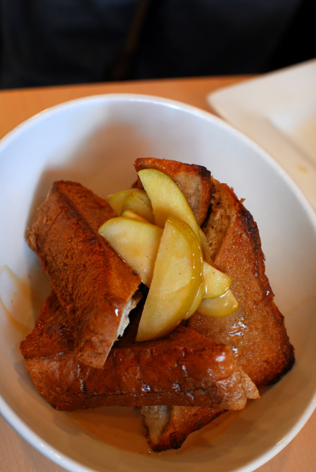 Brandy’s choice of entrée was the Chai tea infused French toast, which came stuffed with ricotta cheese and topped with caramelized apples. The first few bites, she reported, were delectable, but with no side dishes to refresh the palete, it soon became a little monotonous to eat.
