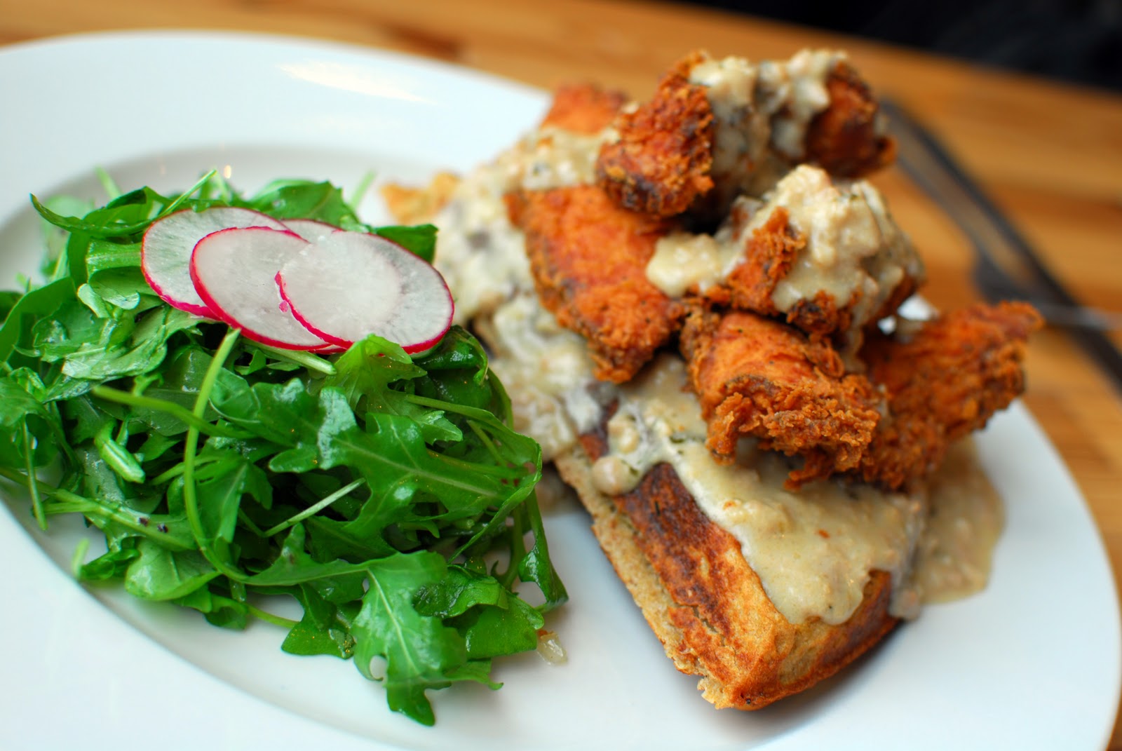 Biscuit’s Chicken and Waffles was thoroughly scrumptious; doused in a spiced and flavorful gravy, the dish left Biscuit with a twinkle in her eye and a smile on her face. “This chicken makes me want to go home and slap my mama,” she said. Seeing that her hostess’ faces had registered a touch of confusion and shock, she simply said, “It’s just an expression. I’ve never slapped my mama, mostly because I would have been slapped back, 3 times harder.” Blank stares met her laughter, so Biscuit shoved a waffle bite into her mouth.