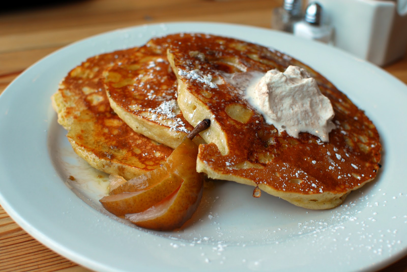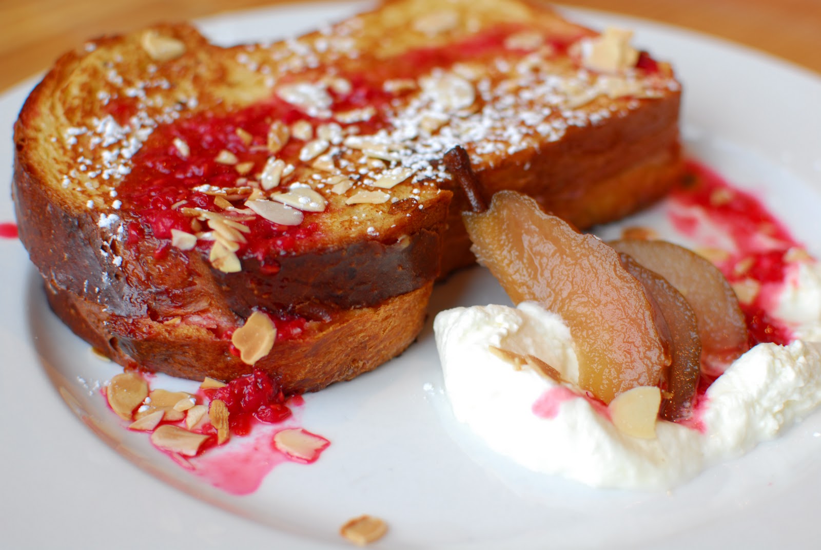 Brandy’s French toast was beautifully presented with whipped cream and a sliced, poached pear. The thick cut brioche was packed with a pink, cheesy filling that was sweet and creamy, but not overpowering to the dish. The pear on the side, while a splendid garnish, also served the purpose of a side dish to help break up the richness of the plate.