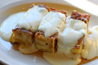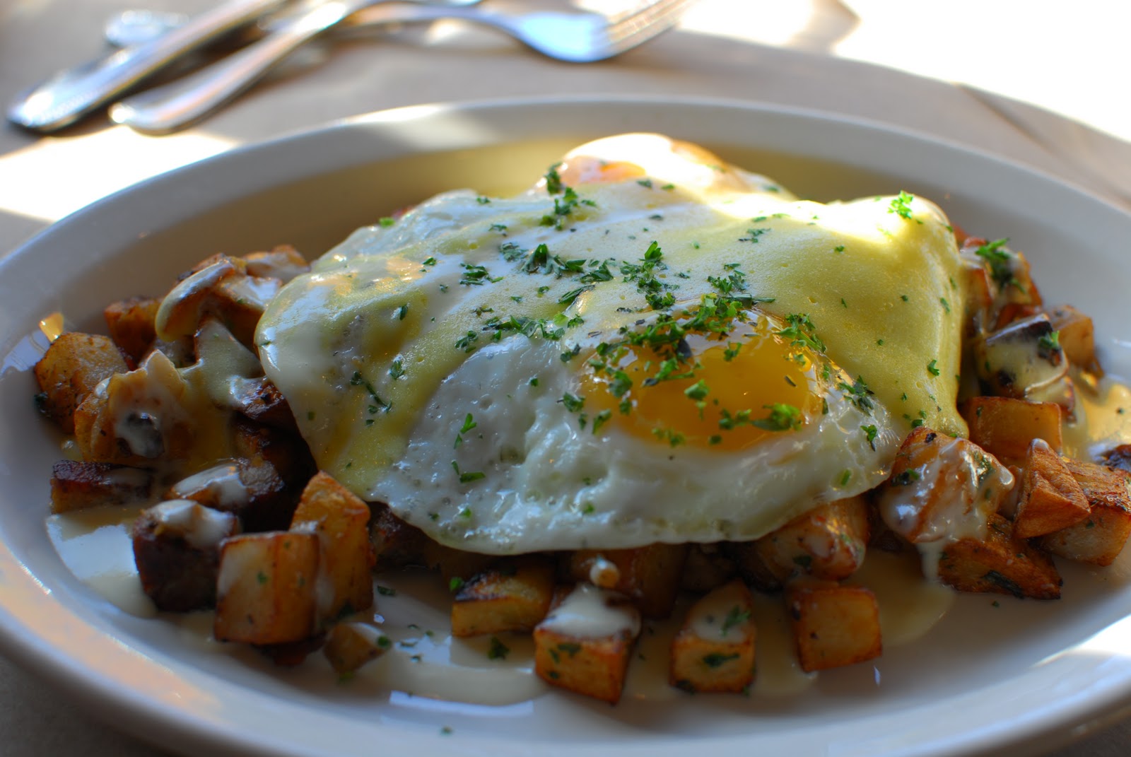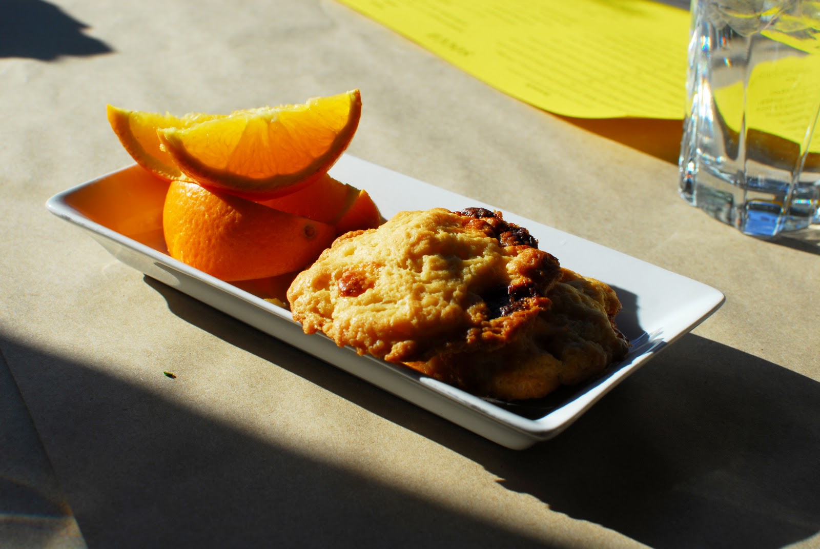 Their waitress presented a plate of fresh baked scones and orange slices along with their water. The scones were warm and citrusy, almost more cookie like in texture. A round of mimosas were ordered (expect for Mr. Bacon, who ordered a Grey Hound, shaken, not stirred) while Our Ladies perused the menus. For Brandy, vanilla croissant French toast and a side of polenta “cheese grits.” For Biscuit, some pork belly potato hash and eggs. For Mr. Bacon, a simple omelet made with tomato and spinach. And Bunny, as always the adventurous soul, ordered the crab cake Benedict.