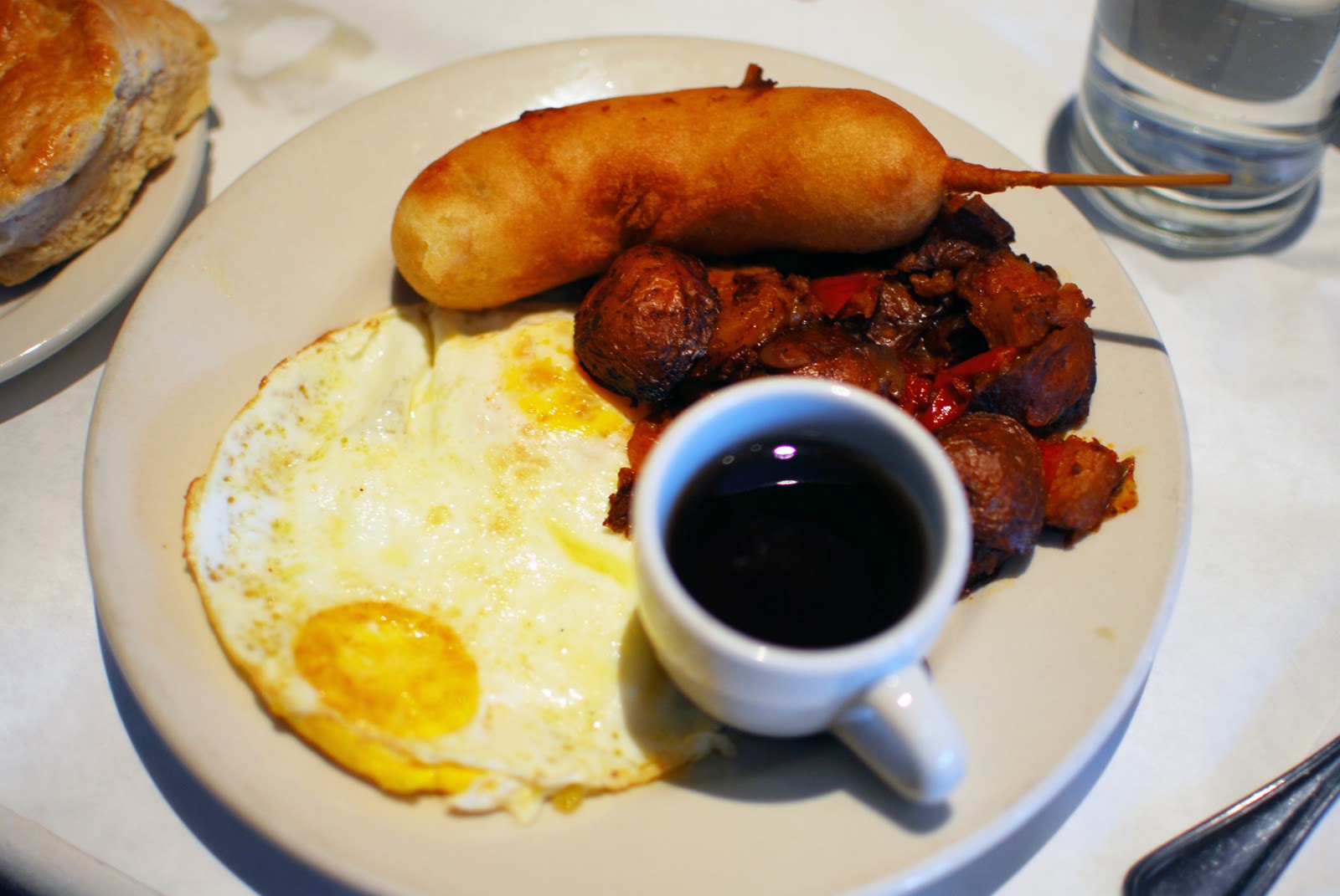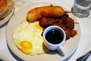 Birdie's choice was the Breakfast Dog, a chicken and apple sausage, wrapped in pancake batter and served on a stick ("As all food should be!" declared Birdie). Yet another dish with the perfect combination of sweet and savory in one bite, it was enough to make an over stressed (and possibly hung over) Birdie smile. The bite in fact was so sweet that the authentic maple syrup served on the side wasn't even necessary. Birdie also ordered a side of biscuits with pumpkin clove butter. While the biscuits themselves were authentically southern, the real standout was the butter, which was sweet and spicy, like a fire made with rock candy.