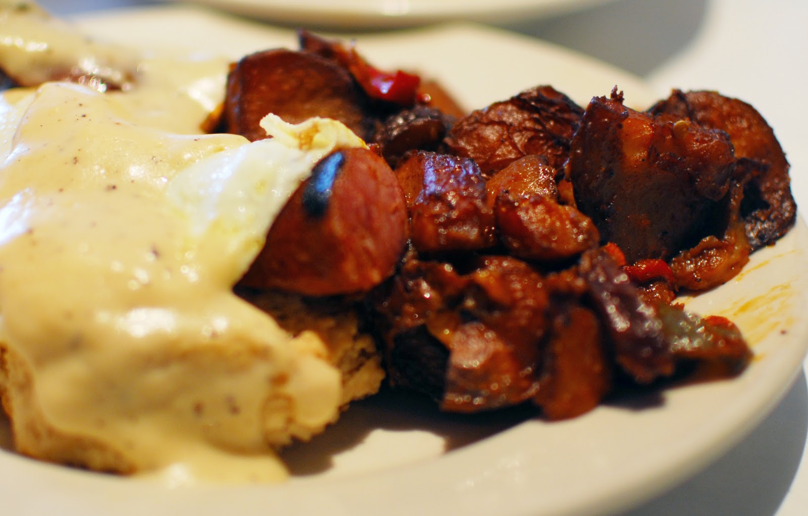 For Biscuit, an order of Andouille Biscuits and Gravy, more southern fair for the Southern Belle. The sausage had the kind of snap one expects from quality and just the right amount of kick to it to make one's morning come alive. On the side were Hearty Boy's prided Smokey potatoes, which did not disappoint in their smokiness.