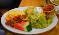Benedict (the husband, not the food) found his omelet to be chock full of veggies and sausage. The heat was present, to be sure, not over powering to the poor man’s senses, which had been dulled by the abundance of coffee he’d drunk during his time in the American Northwest.