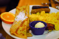 In the midst of the eating fray, the chipper waiter, having been touched by the sight of Bunny and Benedict holding hands under the table, brought the party a plate of some of his favorite dishes to sample. Included were two types of French Toast: a banana bread and a lemon poppy seed, both of which were exceptionally moist, and also a Nutella filled crepe covered in strawberries and banana slices. By that point, Our Party were so stuffed (Brandy found herself requesting a box for leftovers for the first time in living memory) that all they could manage was a bite of each. After paying, Bakewell treated the crowd to an aria before they departed.
