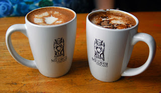 Medici's stone front is at once imposing and heart warming, presenting visitors with a cheerful relief of a gargoyle scarfing down a pastry while being watched by a pope. Once inside, Our Ladies were given the choice of sitting up stairs or down, and despite Brandy whining about her bad knees, Bunny chose the upstairs so that they may have the benefit of a view from above. The upstairs was a warm spot, both visually and literally. The walls which weren't exposed brick were covered in both graffiti and hand painted murals, and the hard wood floors were pleasantly squeaky. Our Ladies were told to sit themselves wherever they liked, so they chose a nice table by a window so that they could gaze out upon the rain. The unfortunate side effect of the seats they chose was that Brandy got squished in between the wall and the table, but otherwise they felt right at home.