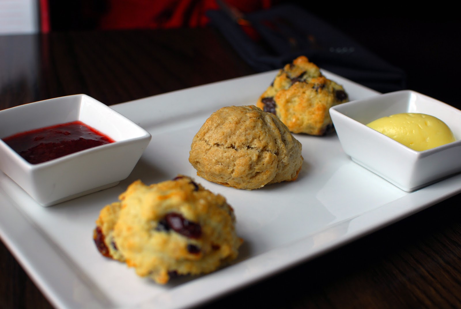 Next came their starter, a plate of freshly baked scones accompanied by clotted cream (Bunny squealed with delight when she saw this on the menu) and strawberry jam. Our Ladies were presented with a plate containing three different scones; a chocolate chip, an Earl Grey, and a cranberry orange. All were delightfully warm, crunchy on the outside, and soft on the inside. Bunny enjoyed the cranberry orange the most (though how she could taste the scone under a giant glob of clotted cream, we do not know) while Brandy favored the slightly denser texture of the Earl Grey.