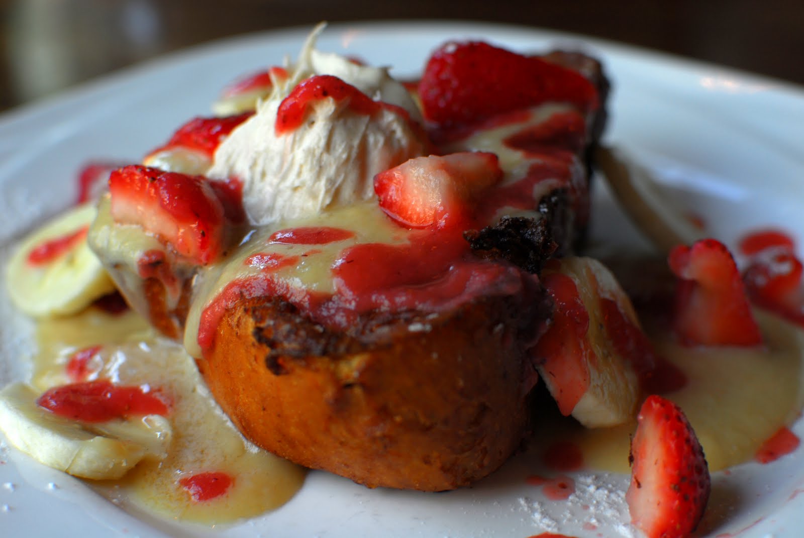 Bunny chose from the "Add Liquor to make it Irish" section of the menu and got the Bailey's and Bananas French Toast. It came as a thick slice of brioche covered in strawberries, bananas, and a creamy sauce. At first bite, the Irish Cream taste wasn't exactly present, though the bread was soft, sweet, and delicious. But after the sauce had cooled a bit, the Bailey's became more present. Bunny felt the strawberries were just on this side of not fresh, but otherwise she thoroughly enjoyed the dish.