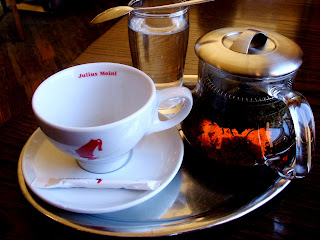Despite Julius Meinl's famed coffee, Brandy picked a lovely white tea called Silver Cloud for her beverage. Brought on a tray with all the implements needed, including a small ginger snap cookie, the tea was very light and fruity, with a soft feeling on the tongue and a sort of caramelly finish. If the morning had been colder, Brandy might have longed for something more full bodied, but on an unusually warm winter's day like that one, the lightness of the tea was more appreciated.
