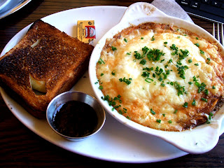 As her main course, Brandy chose baked eggs over a Rösti potato pancake with caramelized onions, Parmesan cheese, and truffle oil. The dish had been topped with chopped chives, the scent of which wafted up to Brandy's nose in the most enticing way. The cheese and truffle oil lent a wonderful earthiness to the richness of the eggs, which were incredibly soft. Brandy marveled at how the yolks were perfectly cooked, having a texture like the finest velvet. The shredded potatoes on the bottom of the dish remained crunchy, tasting like a much more sophisticated version of hash browns. On the side, Brandy chose a slice of brioche toast, which came served with fresh strawberry jam. Brandy liked the choice of brioche for her toast, as it was more delicate and less crusty than a piece of white or wheat.