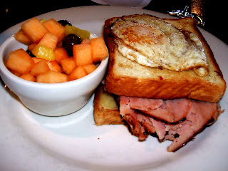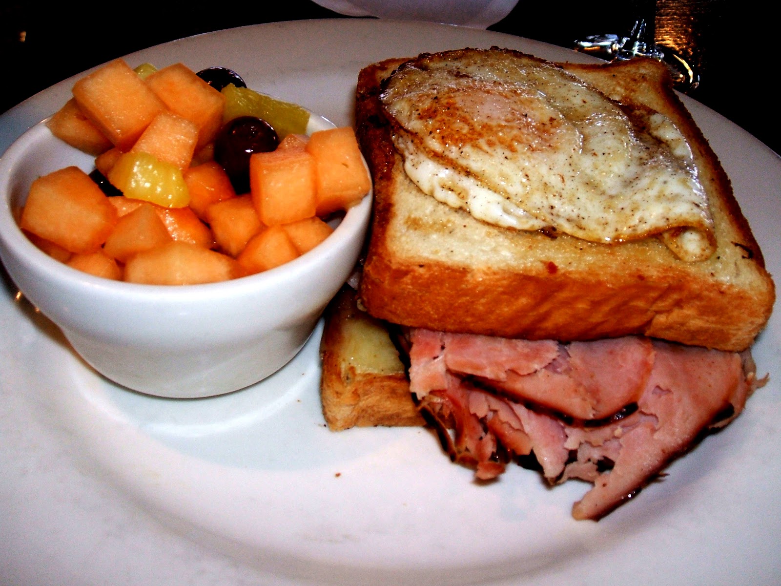 Biscuit chose the Croque Madam, a grilled ham and cheese sandwich with a friend egg on top. The sandwich came packed with so much meat that Biscuit had to resort to a knife and fork to eat it. "My mama always said not to take bites from anything bigger than your head," she said demurely. She reported that the ham was smokey and tender, but that she had expected the egg on top to be poached, rather than fried, which is the more traditionally French way of preparation. "Maybe this Madam Croque is more open minded than you when it comes to her eggs," Brandy suggested.