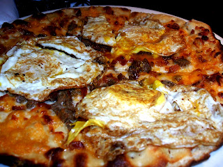 As a final treat, the ladies split an order of Breakfast Pizza. Both of them agreed that this dish was the true star of the day. It came as a lovely cracker crust covered in cheese, bits of sausage and bacon, and several fried eggs, and it didn't take long for Brandy to decimate her half. This, she thought, was the perfect sort of bar brunch food, which she would gladly eat again before dawning a disguise and sneaking into a game.