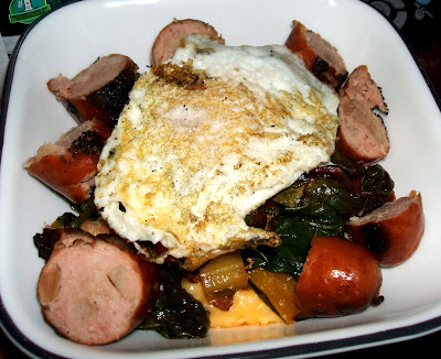 In a bowl or a plate, lay down a bed of the grits, then add some of the greens. Take the fully cooked breakfast sausage and cut into small pieces, then place them around the grits. Lastly, add an egg on top of each plate. Serves 4.