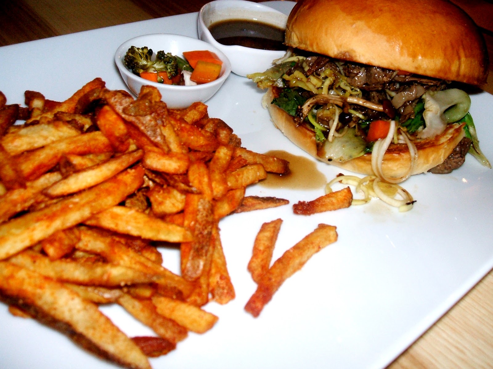 For her entree, Brandy originally ordered the Sweet Pea Risotto Cake, but sadly was told that the kitchen was waiting on the ingredients to make the day's batch, so she instead she settled on the Beef Hodgepodge sandwich. This ingenious idea for using trimmings from some of the more formal cuts of of beef on the menu (shortrib, New York strip steak, and ribeye) came with crisp veggies like carrots, bean sprouts, and baby bok choi on a soft, freshly baked bun, accompanied by some jus for dipping, house made pickled veggies, and a heap of spiced French fries. The sandwich itself was almost more like a stir fry, and was so juicy that the soft bread was soon falling apart, causing Brandy to revert to a knife and fork to finish every last tender morsel. The unusual spice on the fries was almost sweet (possibly from the addition of some sweet paprika).