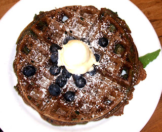 To finish up, Brandy sampled the Waffle of the Day, Blueberry and Cinnamon. The molasses colored outside of the waffle implied the spice, while the oddly, yet whimsically bluish inside showed berries scattered throughout the batter, and the whole thing was topped with some fresh berries and a portion of butter as big as a scoop of ice cream. Brandy found the outside of the waffle to be lovely and crisp, while the outside was soft and flavorful. Although the blueberry flavor was more than present, the cinnamon was a bit more difficult to detect. Brandy especially liked the fact that there seemed to be a fresh blueberry for every bite, though she was a bit sad that the waffle seemed to go a bit soggy towards the end (and that is with a minimal amount of syrup).