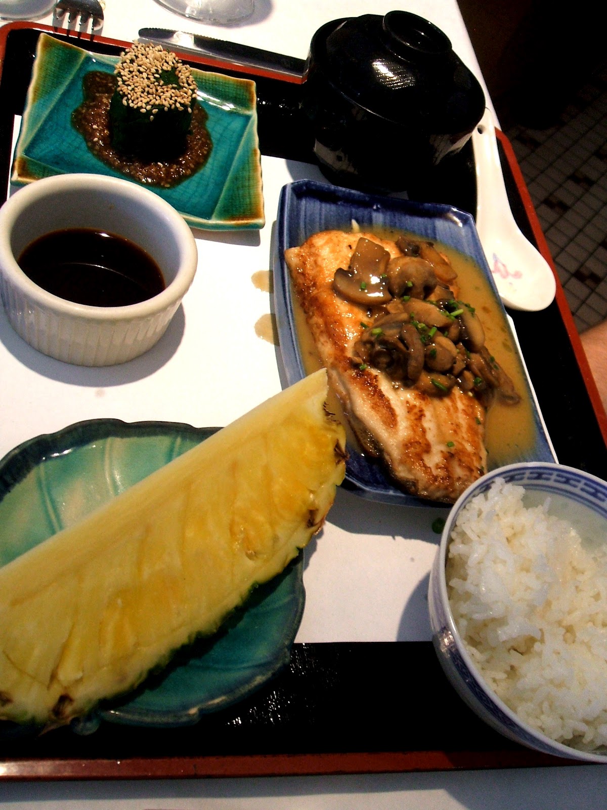 Brandy had been so enraptured by the burger that she completely missed the Japanese Style Breakfast, one just like Chef Takashi had described to Bunny. Fortunately, Birdie didn't miss it. The filling array of food was thus: a large wedge of pineapple, a bowl of miso soup, spinach cooked with sesame seeds, white rice, and a fish of the day, which happened to be cod in a mushroom ginger sauce. The fish was beautifully cooked, being tender and flaky, with the mushroom sauce helping to combine the animal of the sea with the earth. The soup was warm and filling, the spinach salty and sweet, and the pineapple was nicely cut along the rind for easy eating. "Reminds me of when I was stationed in Osaka," Birdie mused, "There were these lovely women who worked at our base and they used to bring us plates like this every morning." "That was a hotel, dear," Biscuit corrected him.