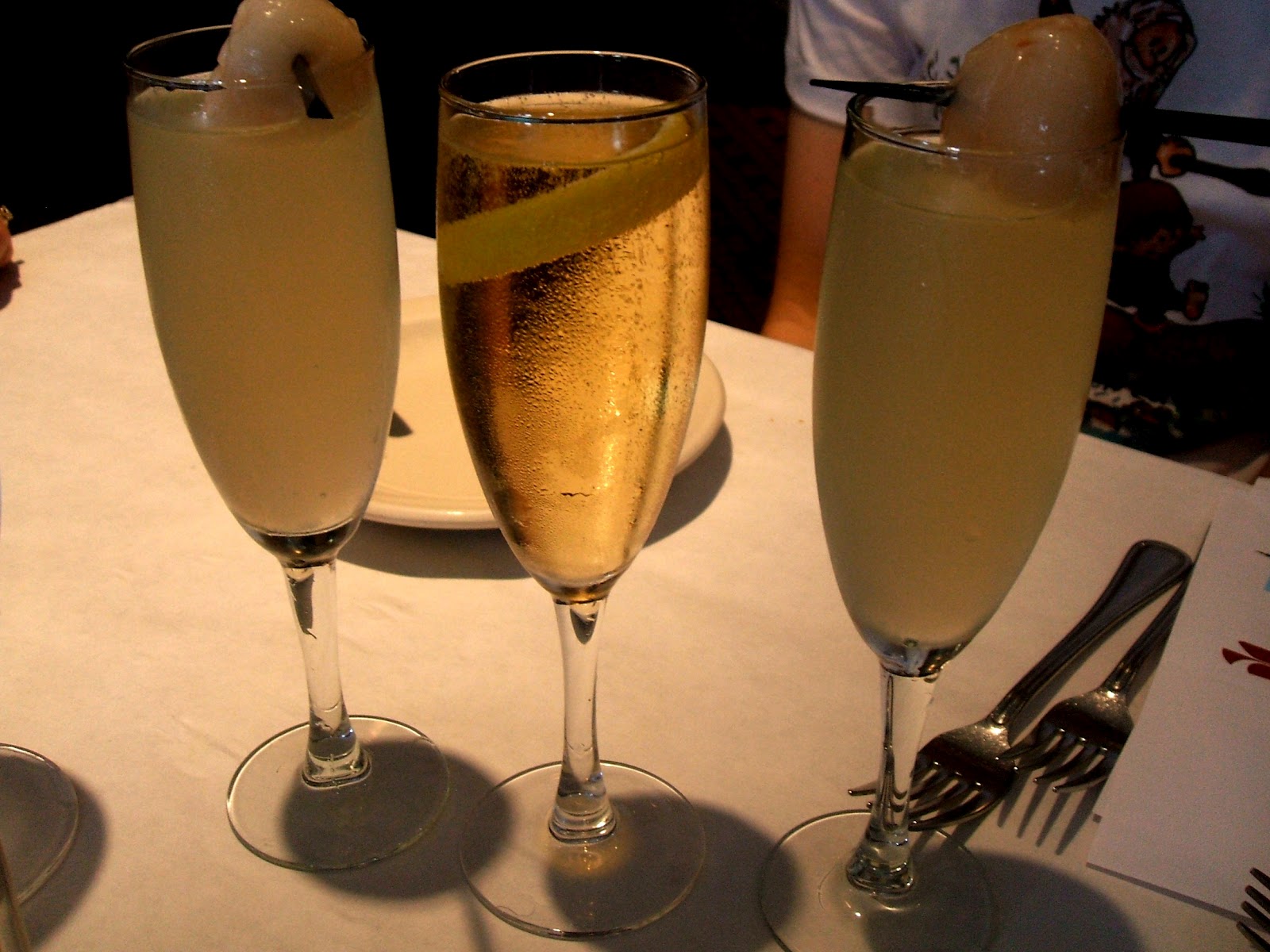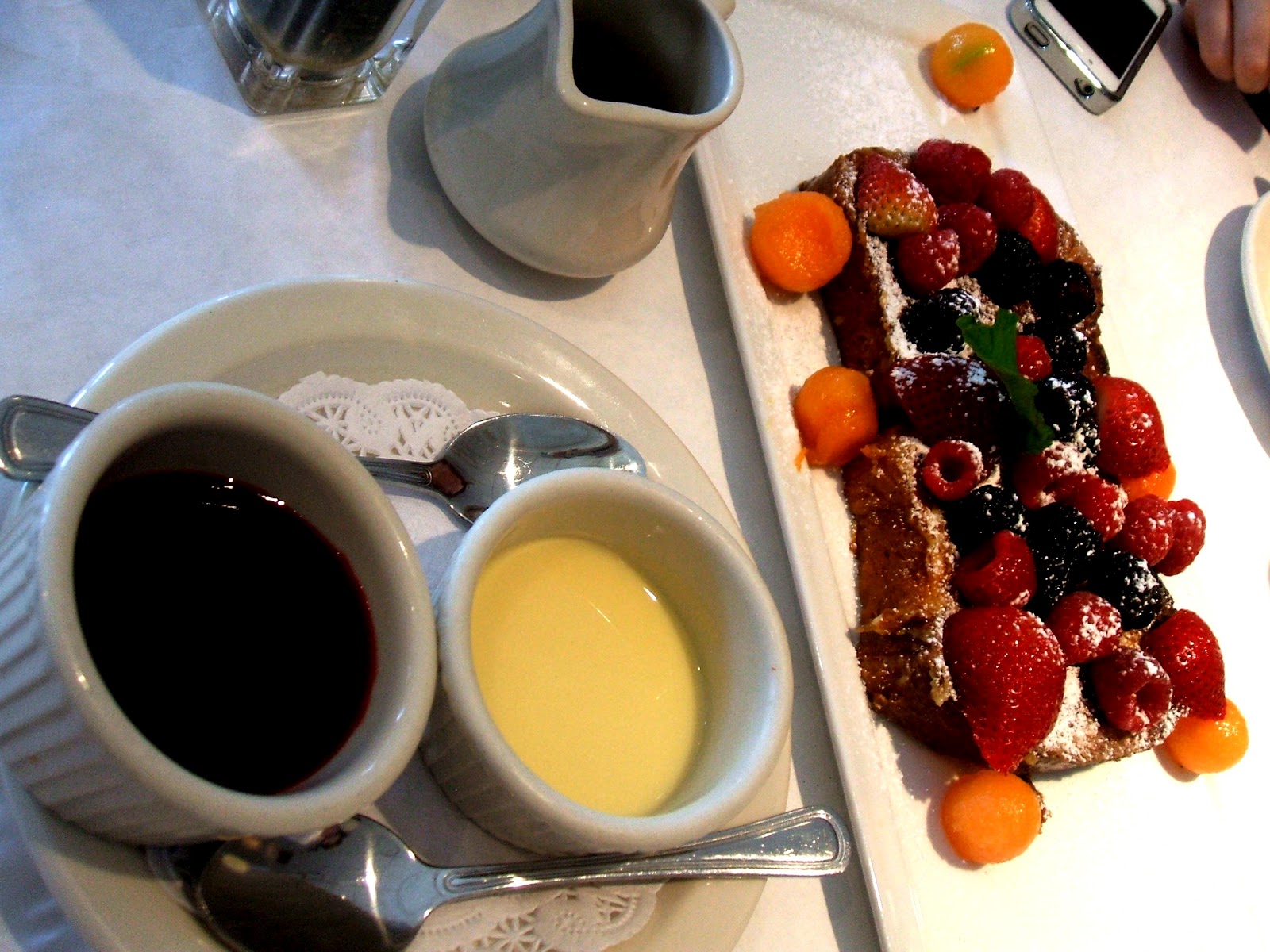 Upon sitting down, the group were presented with a basket of freshly baked croissants, marmalade, and whipped butter. Birdie wasted no time in diving for the marmalade, while the ladies listened to their adorably attentive waiter explain the specials. As mimosas were half priced, a round was ordered, with Brandy and Birdie choosing the lychee flavored variety, while Biscuit sided with the plum wine mimosa. Both types seemed traditional at the start, but the lychee one proved to be more light and sweet, while the plum wine was a bit more acidic. Brandy especially liked the skewered lychee nut that had been balanced over her glass. "It almost looks like a scallop, its so huge!" she remarked.