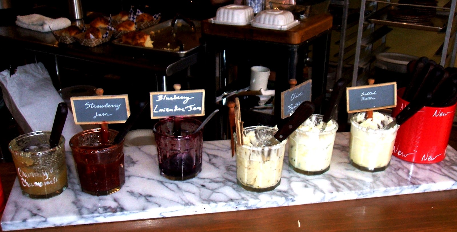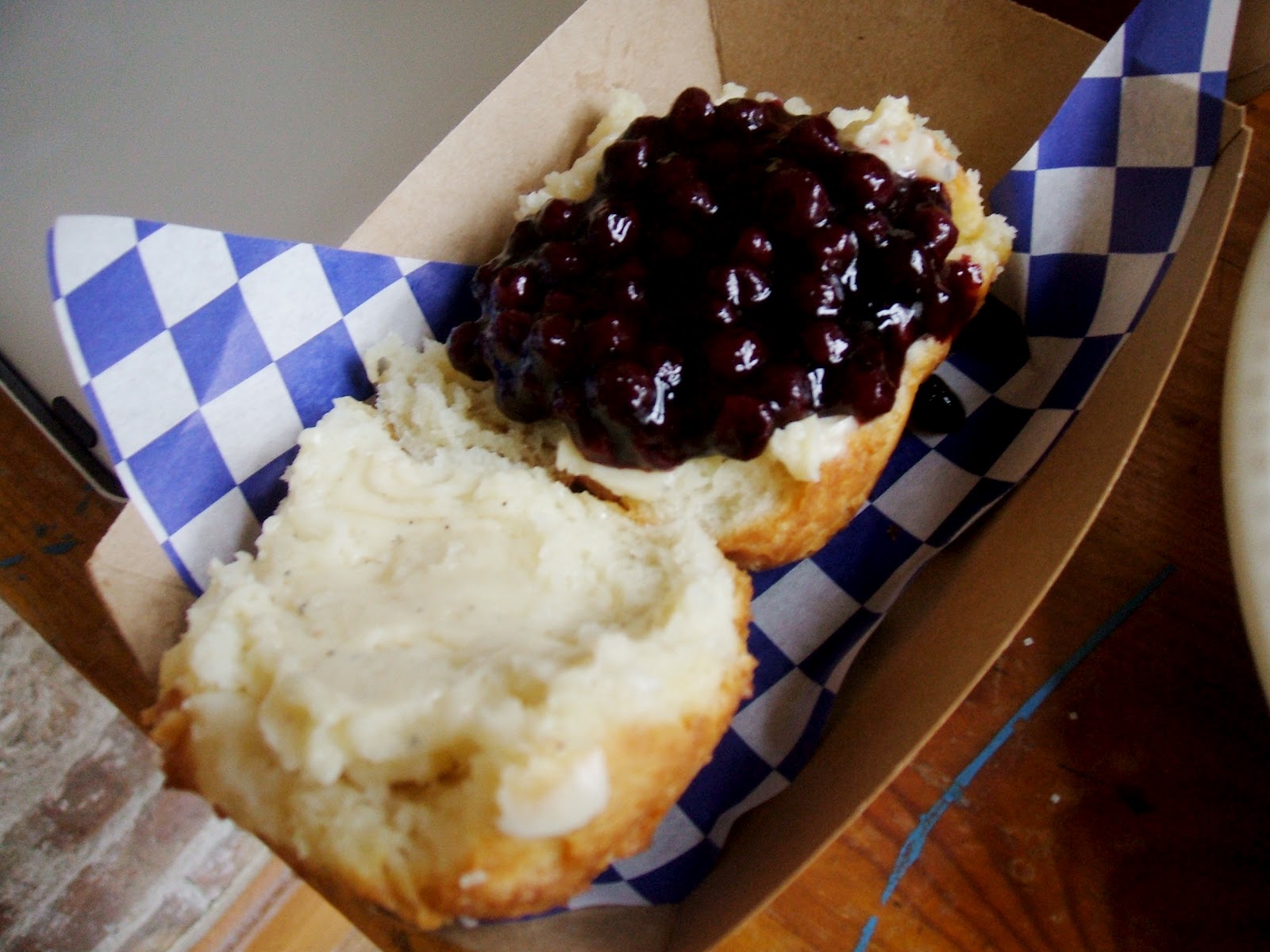 The menu was limited to only a few items at any given time: fresh roasted coffee served hot or iced, three seasonal flavors of pie (Bang Bang usually keeps on hand a cream pie, fruit pie, and chocolate pie), and home made biscuits. The pies on offer that day happened to be a simple Blueberry Pie, a Chocolate Banana Peanut Butter Pie, and what they were calling a Summer Pie, which turned out to be an frozen pie (or ice box pie) made from sage ice cream, lemon curd, and raspberries. Brandy went ahead and ordered a slice of each for she and Biscuit to share, as well as two of the biscuits, one plain and one with gravy. The perk of the unadorned biscuit was the trip to the "toppings bar" which included several herbed butters and home made jams.