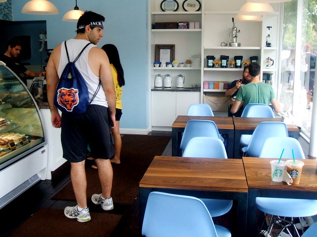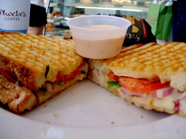 Their brunch spot of choice this week was the newly opened Phoebe's Bakery, formerly Phoebe's Cupcakes. While the old location focused mainly on the aforementioned trendy baked good, the newer and bigger location provides not only sweet pastries, but gourmet paninis made with freshly baked bread, exciting coffee drinks, and other goodies. The interior was rather small, with only a few tables for dine in patrons, but smartly decorated in clean blues, chocolate browns, and creamy whites. A clearly labelled display case showed off the colorful wears, while an elaborate menu overhead demonstrated the rest of what was on offer. Unfortunately, bad ventilation made the room freezing cold one moment and boiling hot the next, and at one point a small bit of smoke invaded the shop from the kitchen and caused Biscuit and Brandy's eyes to water and itch.