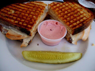 Biscuit decided on the Mockingbird, a sort of Thanksgiving themed sandwich with turkey, stuffing, and a cranberry dipping sauce. Biscuit loved the moist, flavorful roasted turkey slices along with the big chunks of herby stuffing (Brandy was skeptical of the "bread on bread" combo until she tasted it) but she felt that the cranberry aioli was what really brought the dish together. "You know I love some sweet and savory playing nice. Just like the North and the South did, right honey?" "Yes," said Birdie, "That is what's in the coffee."