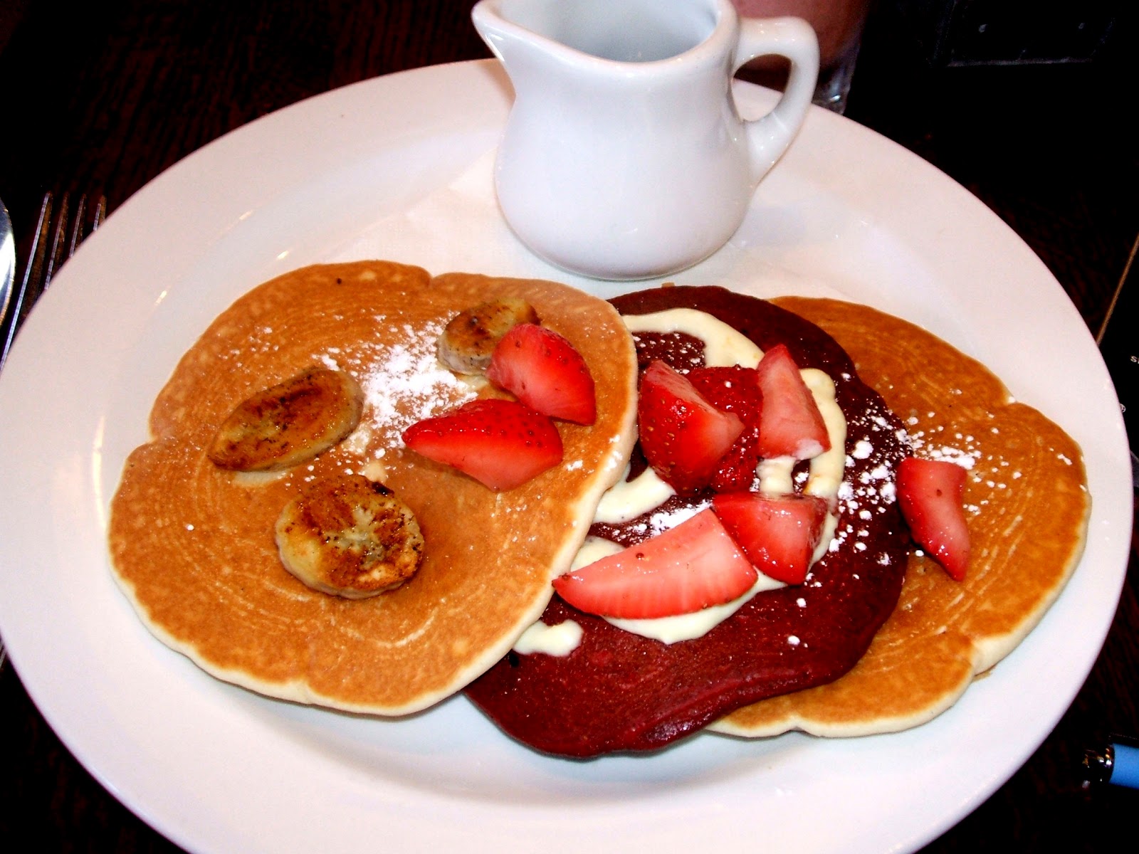 Brandy decided to start off with the Pancake Trio, a sampler plate of three different flavors. Or, at least they were supposed to be different flavors. Though the menu listed the plate as offering buttermilk, banana, and red velvet pancakes, Brandy soon deduced that the banana pancake was no different than the buttermilk, other than that it had been topped with a few slices of caramelized banana. "Seems to me they could have mixed the banana into the batter at the very least!" she huffed. Though quite ordinary, the pancakes were rather tasty with a nice fluffy interior. She very much enjoyed the red velvet variety, which had the slightest little hint of chocolate. "Seems red velvet is all the rage these days, but not a lot of places do the flavor justice," she said to no one in particular, "This very much honors that flavor, which is so hard to pin down. Very commendable."
