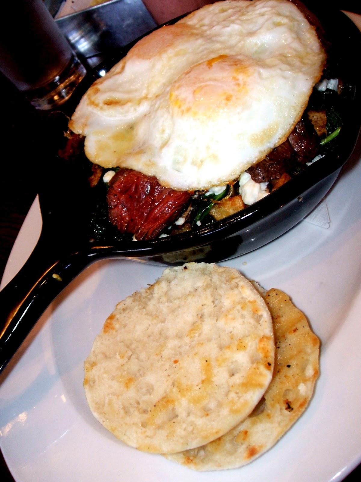 As her main dish, Brandy selected the Steak Skillet, a mish mash of veggies, meat, potatoes, eggs, and cheese. This hearty sounding dish was love at first bite. On top, the eggs (which Brandy had ordered over medium) were ever so slightly over cooked, but not enough to bother her, as the yolks still ran for the most part. The next layer was the steak, which was juicy, tender, and plentiful. Below that, the goat cheese, which added the most wonderful creaminess to everything. Then came the mushrooms and spinach, which were fresh, perfectly seasoned, and not at all watery. Lastly was a layer of cubed potatoes, which even though they had been hiding underneath all the other goodies, had somehow still maintained a crispy texture on the outside and a wonderfully smooth interior. All combined together, Brandy could not get enough of the dish, scooping up different combinations of ingredients to make every bite a new experience in flavor.