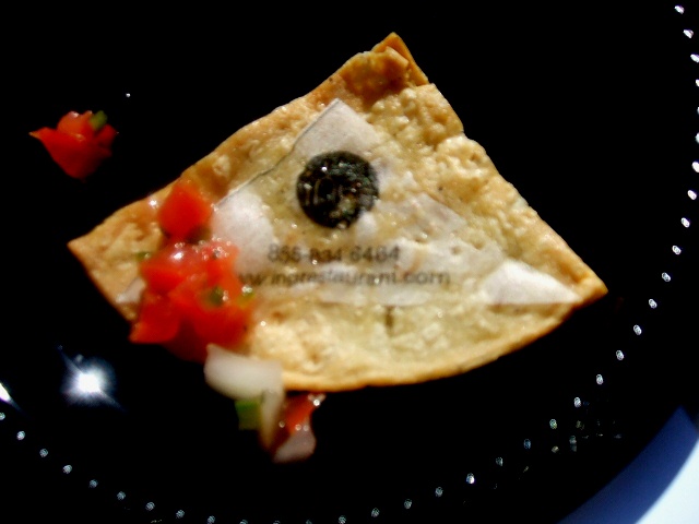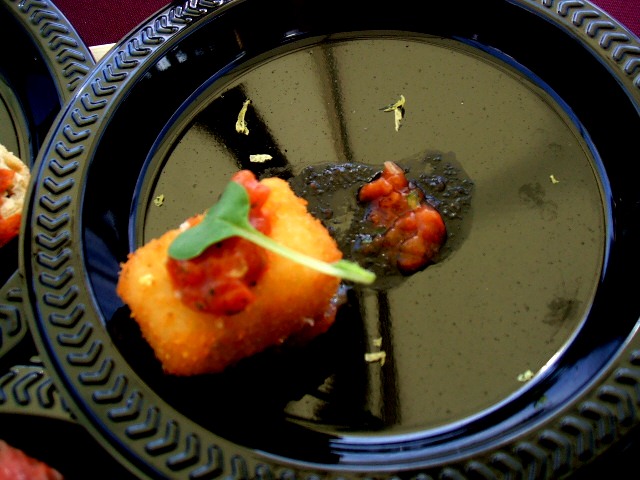 Chef Homaro Cantu from Ing with edible business cards printed on tortilla chips and served with pico de gallo. Brandy could only shake her head and laugh at these two for not only keeping things simple when others chose much more elaborate food, but for actually bringing along a sense of humor (this was later demonstrated at their cooking demo, where more things were inhaled, smoked, vacuumed, melted, and decorated than actually cooked).