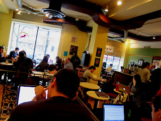 Having staked their claim, they approached the large counter at the front of the shop to place some orders. Brandy had a hard time getting the attention of the young girl at the cash register, who halfway through Brandy's order began conversing with one of the other employees. Brandy gave her several stern coughs and eventually finished her order.