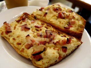 She started off the the Tarte Flambee Baguette, an open faced sandwich topped with bacon, caramelized onions, and sour cream, then set under a broiler to toast. The bread and a wonderful crunchy crust, but incredibly soft innards, which made it easy to bite off pieces and chew without too much effort. The bacon was in thick chunks, making each mouthful full of smokey, meaty flavor, while the onions provided a subtle, sweet note. The true star was surprisingly the sour cream, which having lost some of its moisture while being broiled, had turned into something more resembling a smooth goat cheese.