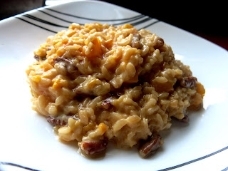 Turn the heat down to medium low and add one cup of the hot juice to the rice, stirring to incorporate. Cover and cook for about 5-10 minutes, or until most of the liquid has been absorbed by the rice, stirring frequently to prevent the bottom from burning. Continue adding the juice by 1/2 a cup at a time, each time waiting until the liquid had been absorbed before adding more.