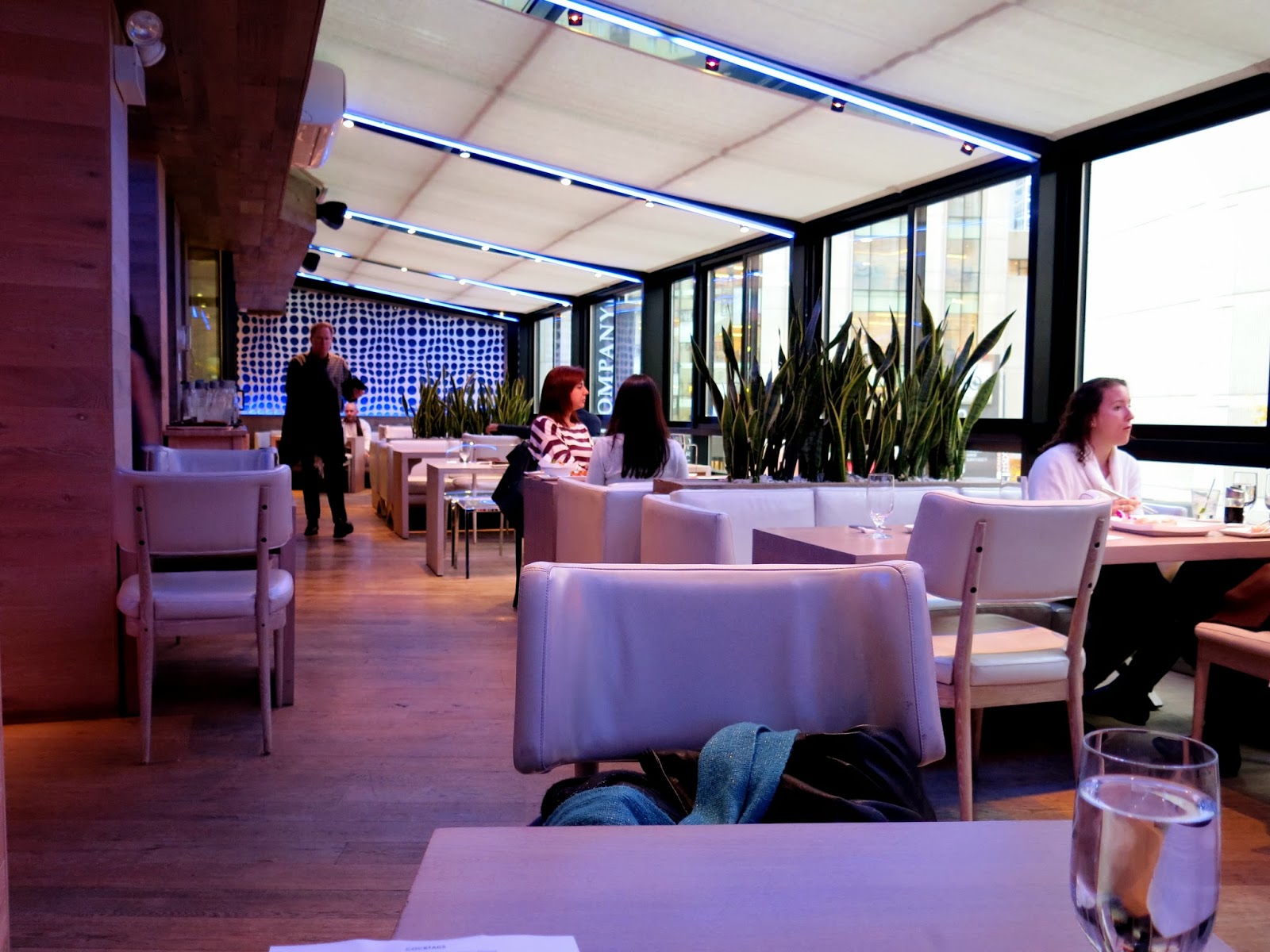 Once upstairs, Brandy found a truly beautiful space with clean white booths, swirling blue lights, a majestic bar, and beautiful views of the street below. She was taken to a table straight away and handed a few menus, one of which boasted some of the "special" rolls on offer for only $5 each in honor of National Sushi Day (though she was a little disappointed to see that only one roll per person was available at the special price). It wasn't long before Brandy realized how in over her head she was (though Brandy is a great lover of sushi, she doesn't usually brunch on it) with the myriad of choices available. "Well, there's only one thing for it," she proclaimed, "I'm going to treat this brunch like any other brunch and combine my sweet and savory."