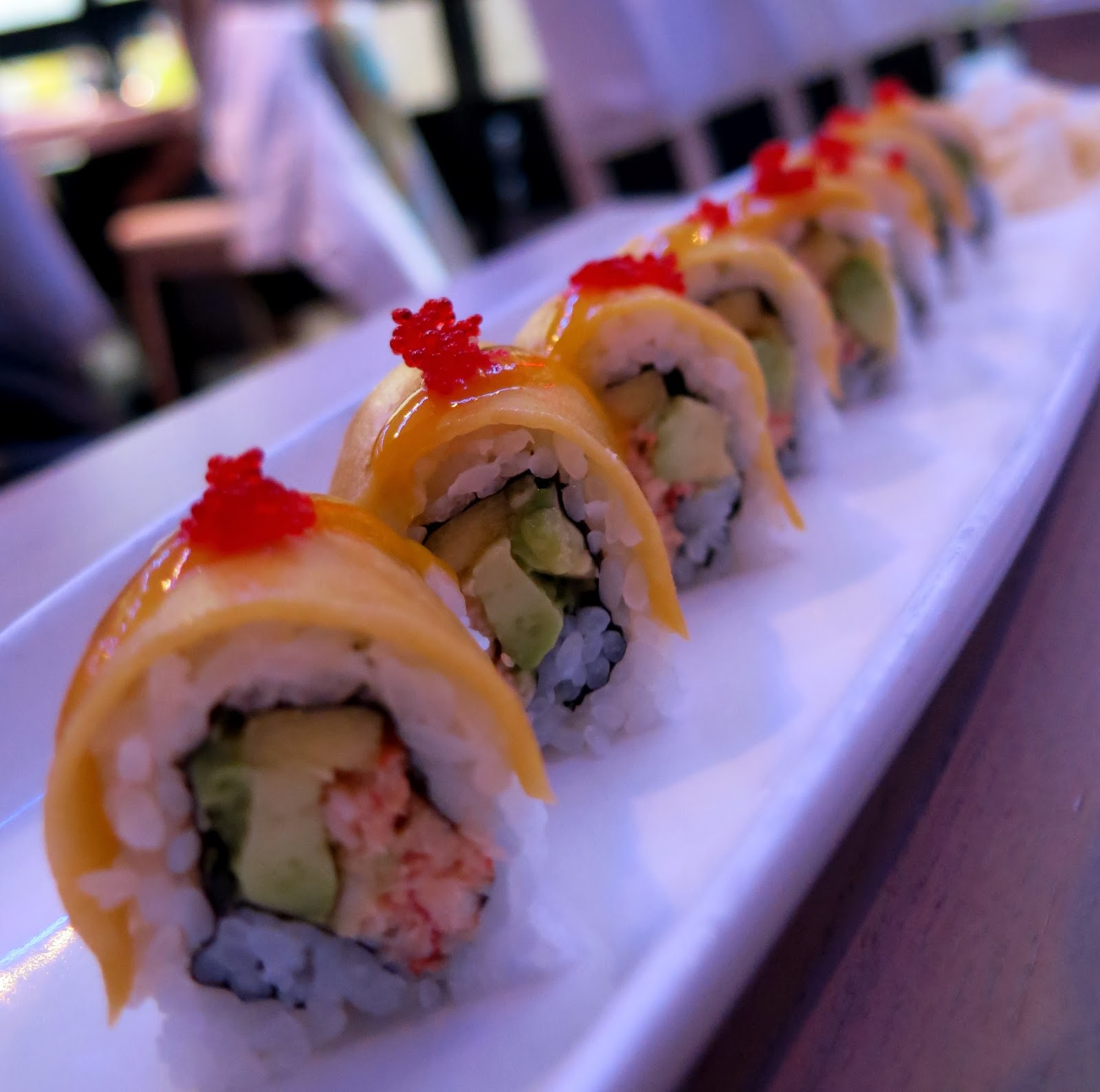 Brandy then picked the Lobster and Mango roll from the specials list. The dish was presented beautifully with the succulent lobster peeking out from the center of the roll along with some avocado, then topped by slices of bright mango and a little sprinkle of flying fish roe on top. Though the flavors went very well together with the sweetness of the mango being the most predominant note, Brandy longed for an element of texture to this roll, as the lobster, avocado, and mango melted similarly on the tongue. "But I do appreciate the little salty hit from the fish eggs," she mused, "If it wasn't for that, I think I'd be quite bored by this."
