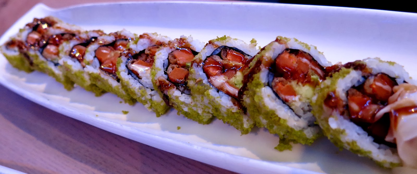 To finish, Brandy chose the Sweet P roll from the regular menu, which boasted a filling of sweet potato, cream cheese, and avocado topped off with spinach tempura and a sweet soy sauce. This roll really delivered the texture Brandy was craving in the first one with just a little elegant crunch from the tempura flakes and a smooth, uniform interior. "I would think vegetarians would be excited for this roll, as its a sort of unusual combination," Brandy pondered.