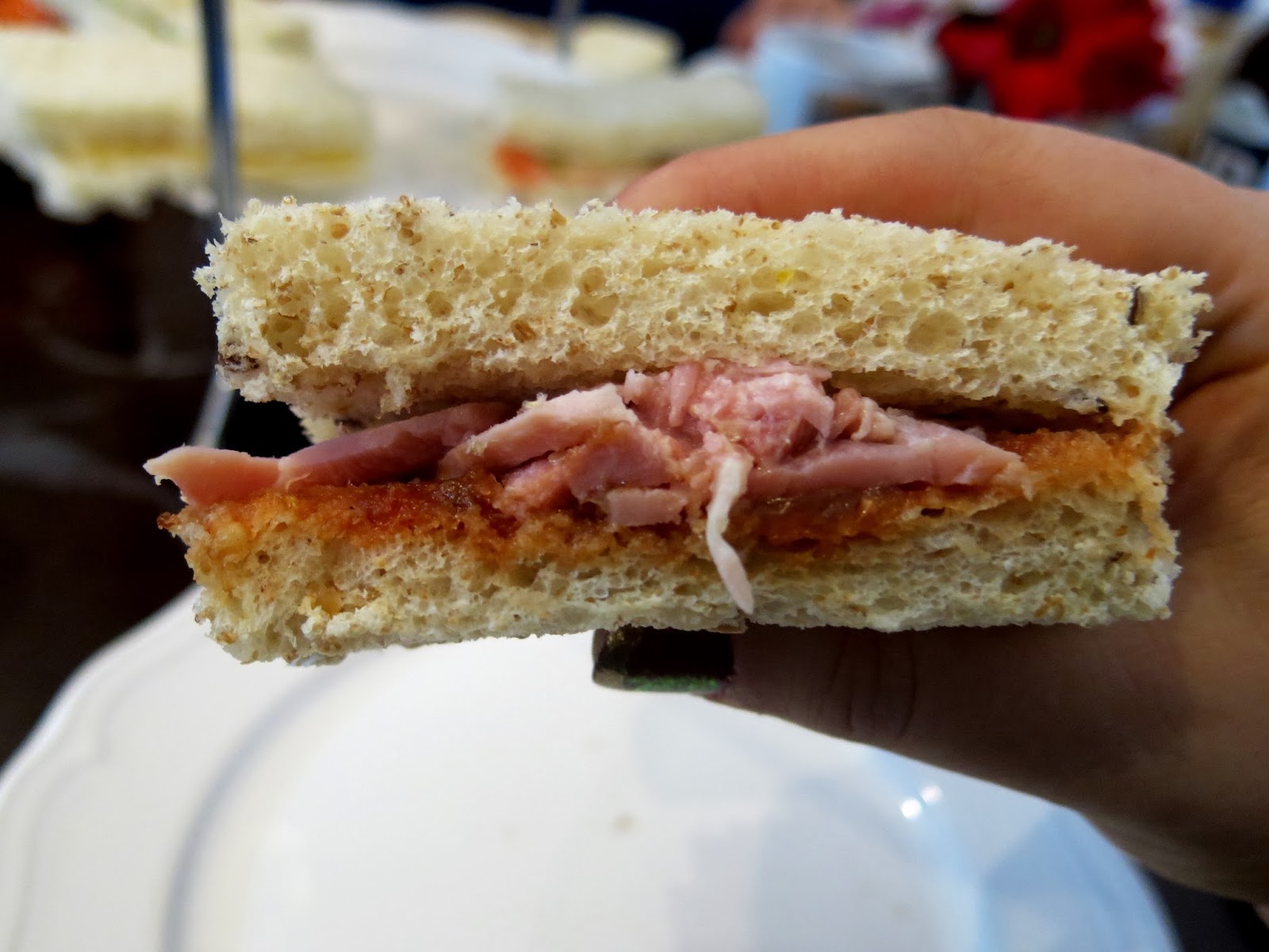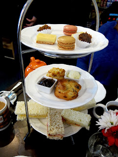 The edible portion of the cream tea came next with three lovely selections served up on a tiered tray; the bottom plate housed a selection of finger sandwiches, the middle two freshly baked scones with pots of strawberry jam and clotted cream, and on top a variety of pastries.