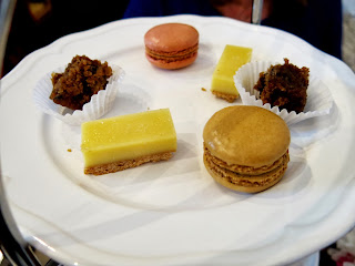 Lastly were the pastries, which consisted of a few French style macaroons, slices of lemon cake, and a little bit of sticky toffee pudding. The two macaroon flavors they had been given were a raspberry with a beautiful jammy filling and a toffee, which had a buttery, toasted nut flavor to it. The lemon cake was creamy and smooth with a good true lemon flavor. Brandy would have gladly eaten more of the sticky toffee pudding, which was just enough for one bite of rich, moist, and buttery goodness.