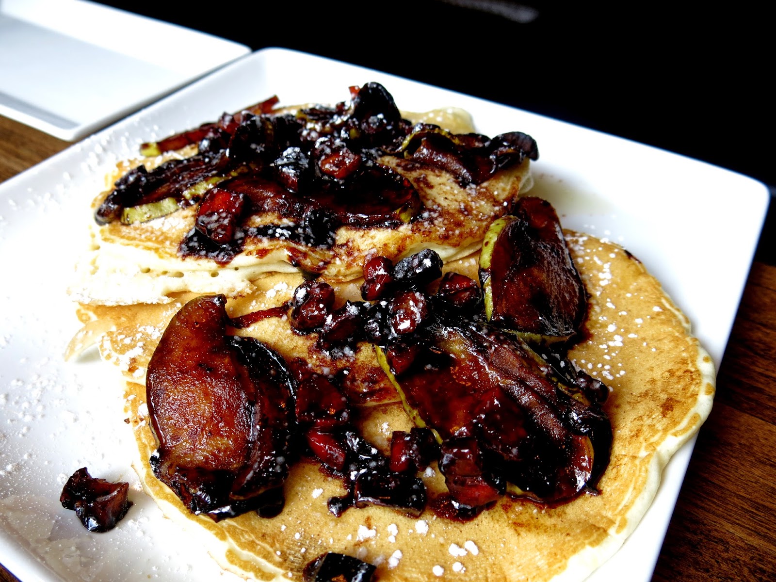 They opened the meal by splitting an order of Apple Pancetta Pancakes, a combination that seemed a nice twist on the trendy habit of restaurants everywhere to add bacon to everything. The pancakes themselves were fluffy, but with some weight to them, and fairly massive in size. The toppings, which consisted of thin slices of green apples and small chunks of pancetta, had been caramelized to perfection. The apples still retained some of their tartness, which matched very well with the rich, crunchy, candy coated pieces of pancetta, reminding Brandy why the bacon trend was started in the first place.