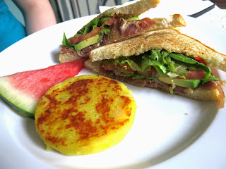 For Bailey's entree, she chose the PLaT, a fresh take on a traditional BLT, but with prosciutto and avocado. The sandwich, Bailey said, was like a dance of textures between the crunchy greens, the creamy avocado, and the tender, salty prosciutto. It certainly did deliver on the promise of a BLT re-imagined in a fresh and more healthy way without compromising taste. The sandwich also came with a slice of watermelon ("I do love a bit of fruit on a brunch plate as a palate cleanser," Brandy beamed) and a Spicy Potato Cake, which was a welcome change from a typical side of roasted potatoes or hash browns. The potato cake was buttery and rich tasting with an almost polenta like texture, as it had a nice crust on the outside.