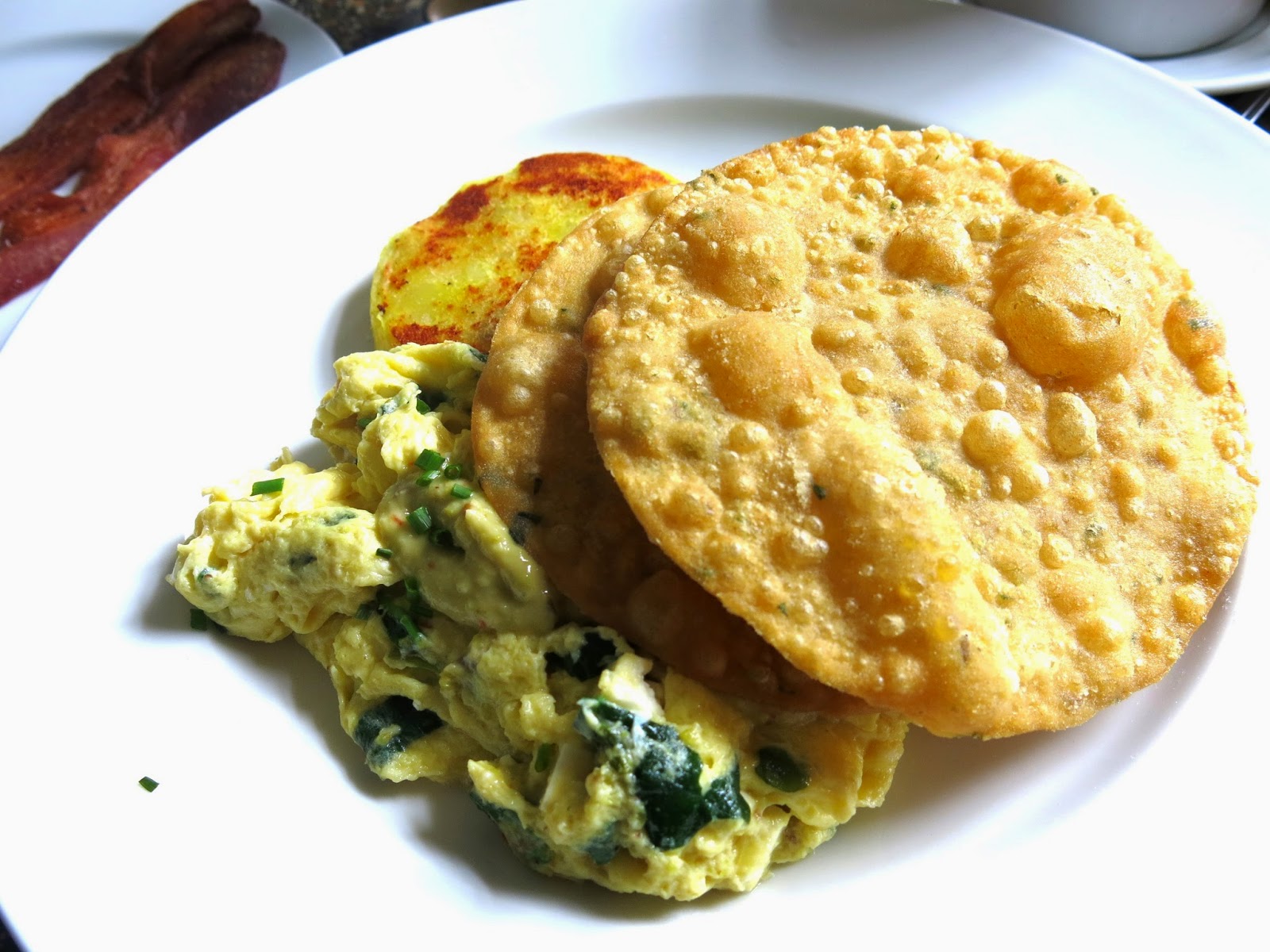 Brandy chose the Saag Paneer Scramble, which added sauted spinach and paneer, a semi firm Indian cheese similar to farmer's cheese or a low moisture ricotta. Saag Paneer has been one of Brandy's favorite Indian dishes for ages, so the thought of combining it with scrambled eggs was quite exciting. Though tasty, Brandy did wish the eggs had a bit more of a spicy punch to liven up the palate. The dish came served with two pooris, a deep fried flatbread with a sort of garlicky seasoning that took the place of toast on a typical breakfast plate. Brandy really liked combining the pooris and the eggs to add a bit more excitement to each bite.