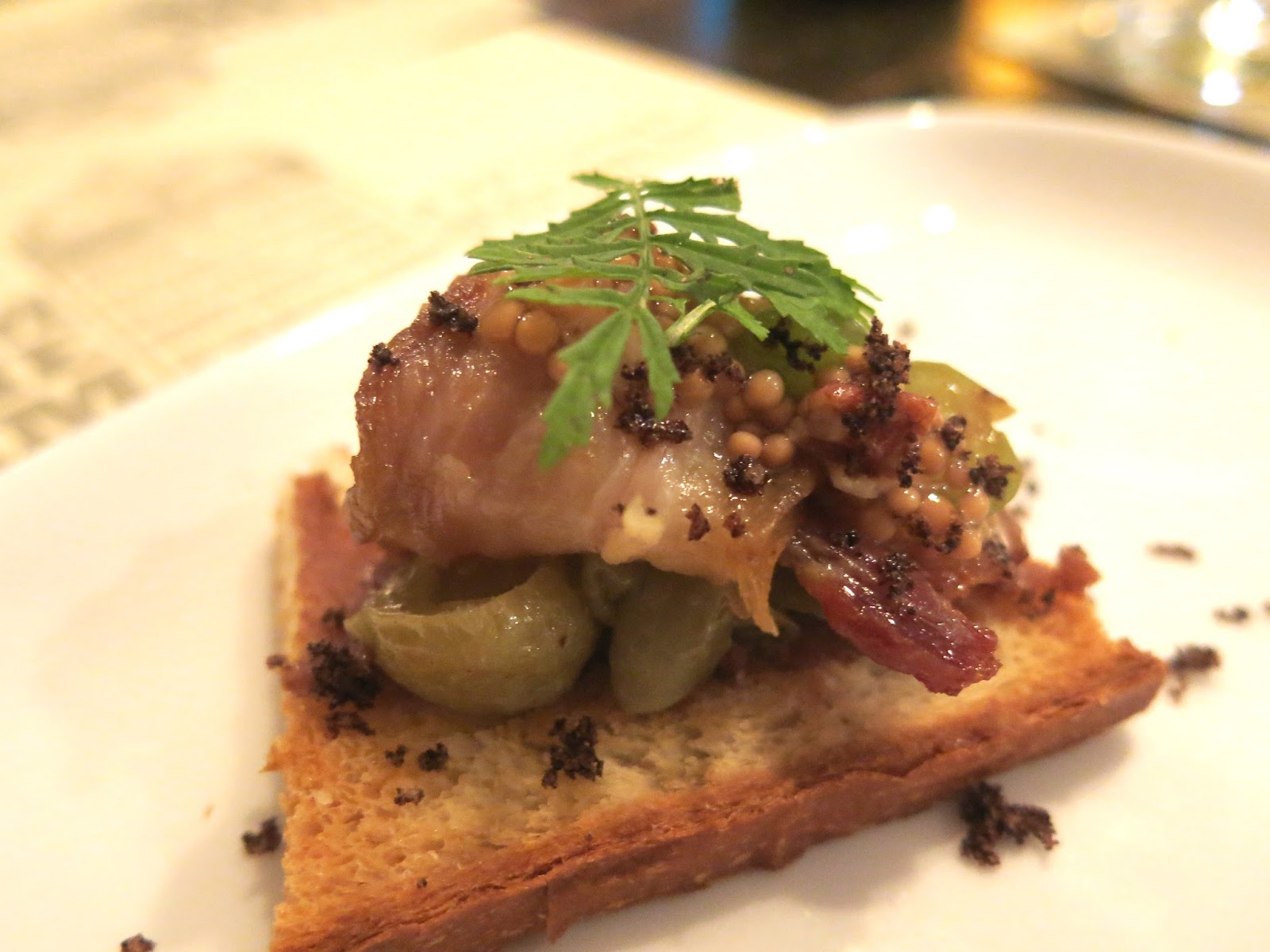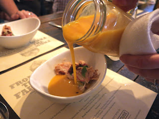 After a gorgeous and fortified summer cocktail, the first of the dishes arrived at the table. The first course consisted of a simple amuse bouche, made with green grapes and cured ham on a thin piece of crusty bread. The two bite wonder was a great start for things to come with bright bursts of flavor from the fruit, a smooth umami sensation from the ham, and a nutty, buttery richness from some fresh butter and whole grain mustard. This paired very well with Farmhouse's own Free Priscilla Cider, made with tart apples from their own orchards, which was crisp and rather refreshing with less sweetness than a typical cider.