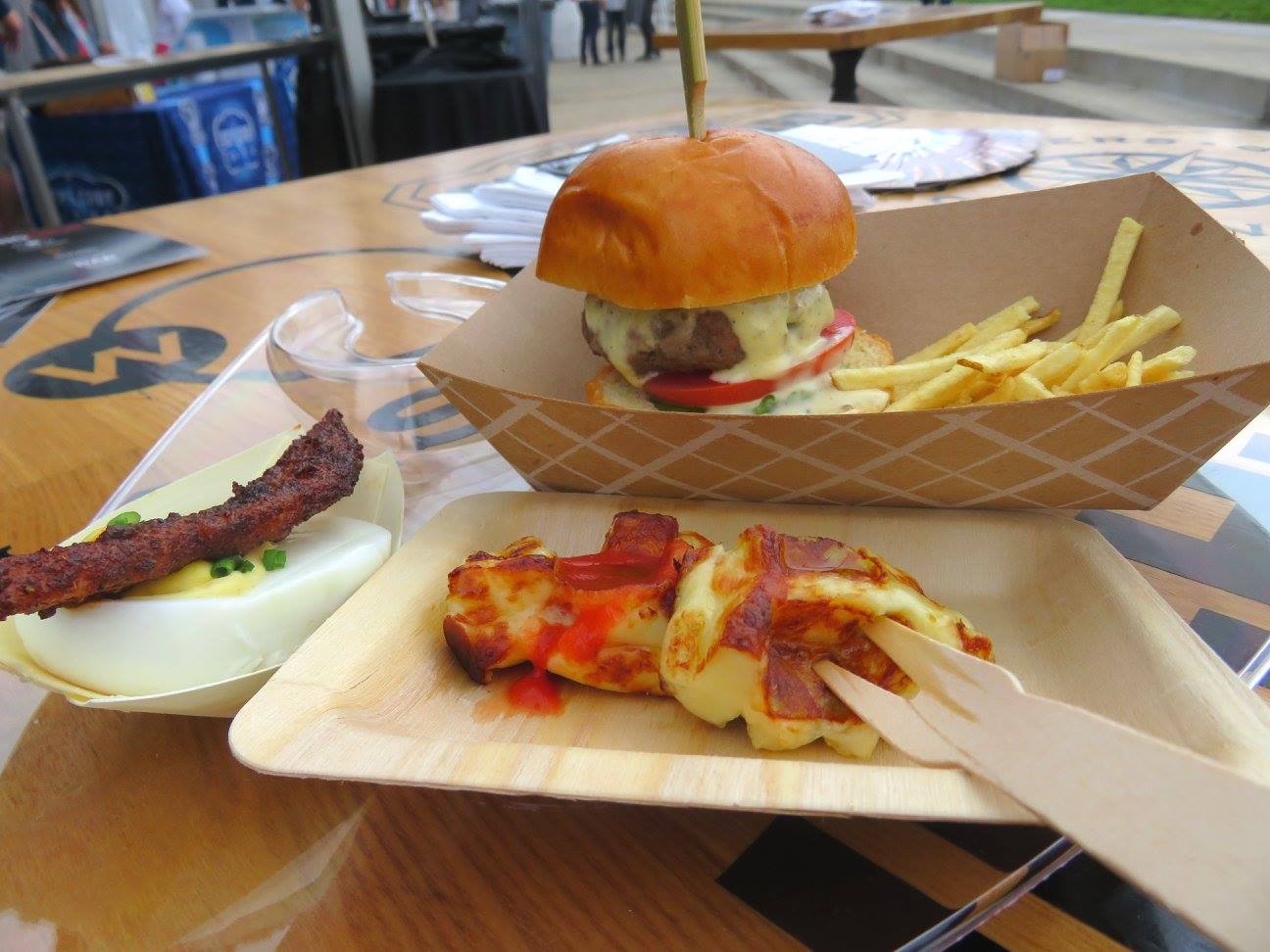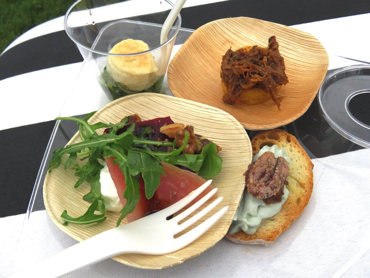 Jumping right into the thick of the festival at 12:00 sharp, Brandy stopped by the Four Corners Tavern Group tent, where they were serving up Moscow Mules in mini copper mugs as well as three pretty unique dishes: deviled duck eggs with bacon, Wagyu beef sliders, and waffled cheese, the latter of which Brandy found had an extraordinary texture that had her craving a second bite. "No time for second helpings though!" she proclaimed, "Onward!" Gibson's Restaurant Group also had their own tent, serving their usual array of crowd favorites like shrimp skewers, watermelon salad, and filet mignon sliders and Rockit Ranch served just one dish and drink at a time, but rotated them throughout the day, Brandy's favorite of which was a coconut street corn and the Strawberry DNA cocktail, which tasted fresh as a summer's day.