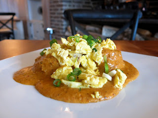 For Bailey's main course, she chose her old standby, the Biscuits and Gravy. This version had been made with chorizo in the gravy and topped with scallions, meaning the usually drab looking brunch staple was actually quite pretty and colorful to behold. The chorizo absolutely permeated the plate with flavor, making for what Bailey declared was possibly the best gravy she'd ever tasted. "This is going to sound silly, but you know what it reminds me of? Chili!" she laughed, "You have to remember, I'm from Ohio, so I know what good chili tastes like, and even the best chili doesn't compare to how flavorful this is." The biscuits at the center of the dish were nothing to sneeze at either, having a dense but silky texture and a good bite of green onion and cheddar goodness.