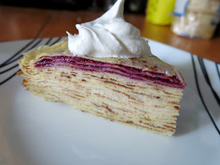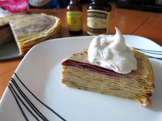 To assemble the cake: In a spring form pan roughly the same size as your frying pan, lay down a single crepe, then pipe a medium thin layer of pastry cream. Add a second crepe and a second layer of pastry cream, then press gently to even out the layers. Add a medium thick layer of berry filling and then another crepe and press again. Continue adding crepes and filling in this manner: crepe, pastry cream, crepe, pastry cream, berry filling, crepe, and continue to press down between layers to keep the cake even. Once all the crepes have been used up, refrigerate the cake for at least on hour to allow it to set. Serve with fresh berries and whipped cream if desired. Makes 8-12 servings.