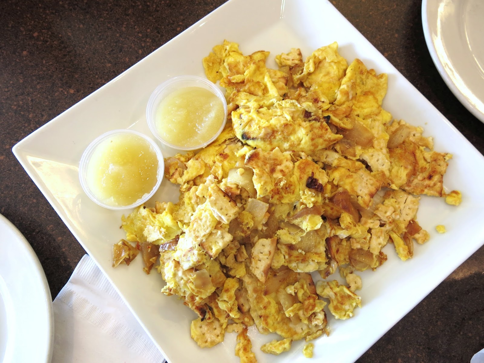 To start off their meal, Brandy eyed up an old favorite of hers, the Fried Matzo (otherwise known as Matzo Brei). She put in an order for the plain version with onions, which also came served with a side of apple sauce, and was delighted to see the dish presented simply. The matzo provided a nice slightly crunchy and chewy contrast to the eggs, while the sweetness of the onions was really brought out by an accompanying dunk in the apple sauce. "Needs a bit of salt though," Hawk commented, to which Brandy pointed out that that issue could easily be overcome by ordering the version with salami the next time.