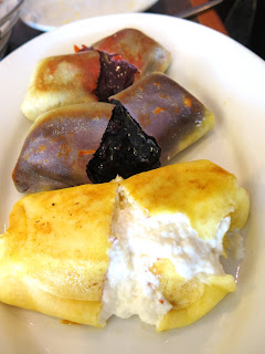 Lastly, they finished off with a plate of Red, White, and Blue Blintzes. The crepe that formed the foundation of the confections was perfectly thin and eggy, while the filling was plentiful. The red (cherry) and blue (blueberry) blintzes were sweet, almost like the filling of a pie, and perfect with a scoop of sour cream to balance them out, while the white (cheese) was sweet, creamy, and utterly savorable. "It almost tastes like cheese cake!" Hawk exclaimed in delight, this being the first ever blintz he had experienced.