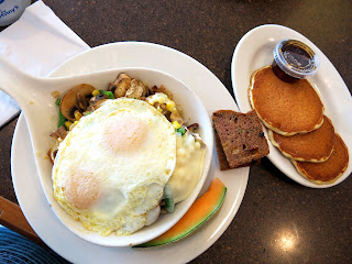 Brandy had picked the Veggie Breakfast Skillet with corn, mushrooms, green beans, potatoes, and cheese, topped off with two over easy eggs and a side of pancakes. Not only did she get what she ordered, but the meal also came with a wedge of cantaloupe and two slices of fruit cake, meaning Brandy was overwhelmed with things to sample. The pancakes had an inherent sweetness and denseness to them that actually made them perfect as a side dish ("I prefer my entree pancakes light and fluffy and my side pancakes substantial," as Brandy put it) and the fruit cake was moist and flavorful. The skillet was jam packed with crisp veggies and melty cheese, Brandy especially liking that the potatoes at the base of the dish had a lovely crisp crust on them to add in a bit of extra texture variation. "I never thought I'd been swooning over a plate of eggs, vegetables, and cheese, but... swooning I am, none the less," said Brandy.