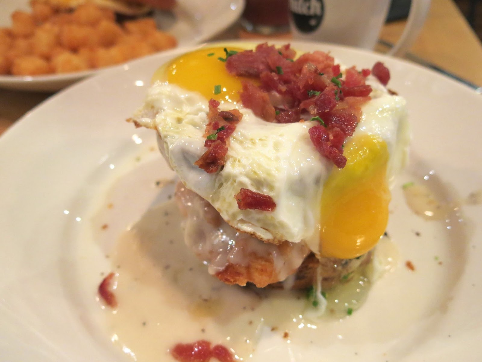 "No idea what is happening. No taxis anywhere and every bus is twenty minutes away!" Bernais texted, followed by a frowny face emoji. "Well, I'll just have to order an entree for her," Brandy reasoned, so she picked the Big Biscuit and Fried Chicken. The menu certainly wasn't joking around when is said that the biscuit was big, as the baked good took up the majority of the plate. It had been cut in half with the aforementioned fried chicken being sandwiched in the middle, then topped with two sunny side up eggs, slathered in white gravy, and sprinkled with crumbled bacon. Though tasty, Brandy found that the biscuit pretty much dominated everything else, even the chicken, which was tender, but not very crunchy. The eggs on top were a little under-cooked for Brandy's liking, with some of the whites still translucent and runny, but the bacon made for a nice bit of flavor to break up the dense, crumbly biscuit. "I know its called the Big Biscuit, but perhaps a little less of it would be better," Brandy supposed, "They could call it the Moderately Large Biscuit. Well, doesn't quite have the same ring to it, I suppose."