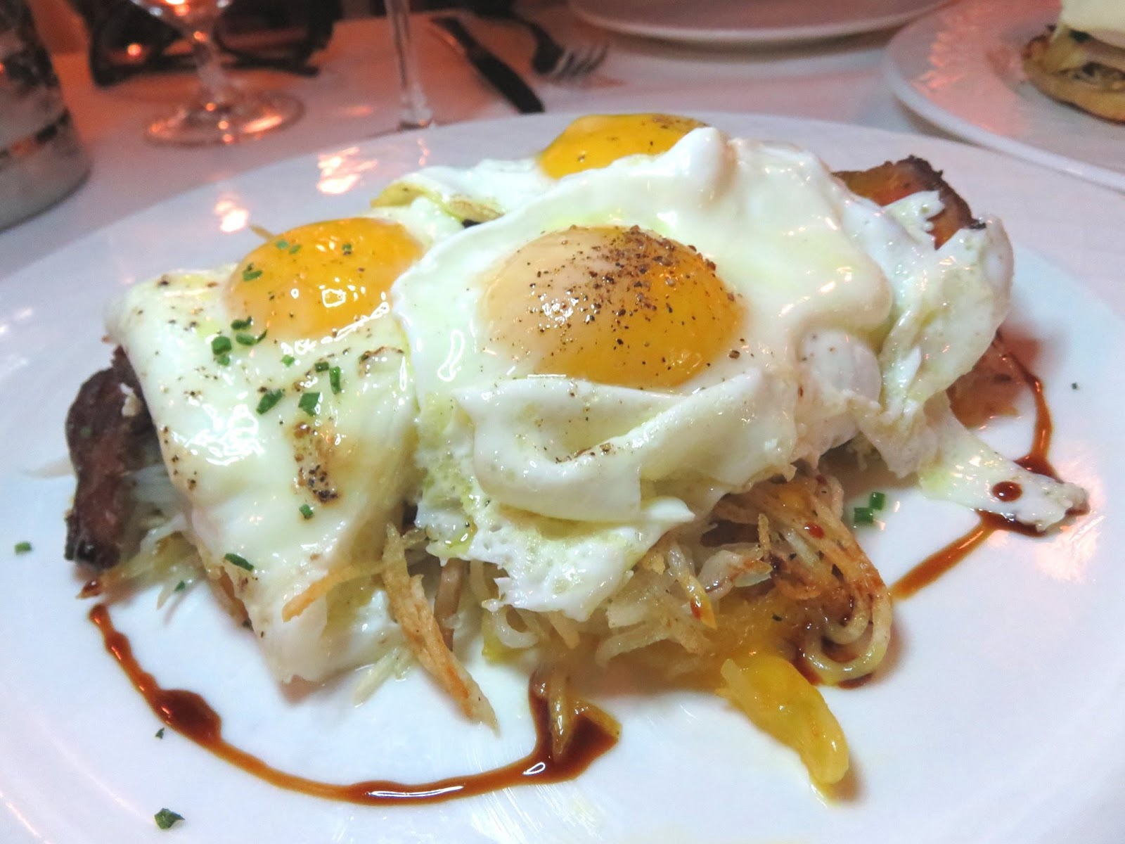 The main courses were next up, the chosen dishes being an Eggs Benedict Florentine with charred artichokes, spinach, and fontina fonduta and the Steak and Eggs with potato hash, king trumpet mushrooms, and caramelized onion. The steak had been cooked to a perfect medium rare (even by Hawk's exacting standards) and had a good char on the outside. The crispy bits of onion and potato were a delight, and the earthy mushrooms added to the richness. As for the benedict, the eggs were poached beautifully, cascading a waterfall of yolk when Brandy sunk her knife into them. The flavor was actually quite unique, having a little more bite and lightness than a typical Florentine benedict because of the artichokes.