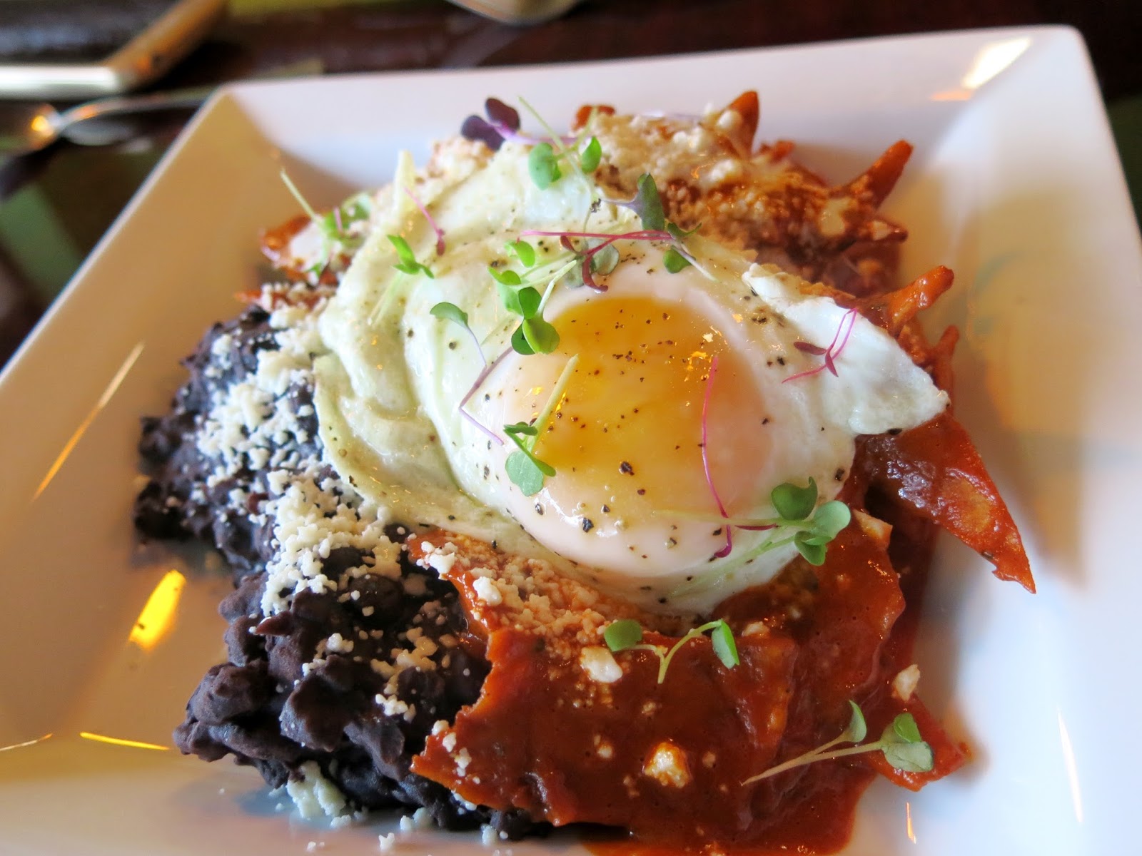 Bailey ordered the Huevos Motulenos for her main course, which was an interesting sounding hash made from black beans, green beans, ham, queso fresco, and plantains, topped with a fried egg and a Molcajete Sauce. "What is Molcajete Sauce?' Bailey had asked Brandy when she was trying to decide which dish to get. "It's a tomato based sauce prepared with a mortar and pestle," Brandy replied (after covertly Googling the answer on her phone). The dish certainly had a nice roasted tomato flavor with a little tang and a little sweetness. Bailey loved all the various textures of the ingredients blending together to make each bite unique. Her special favorite on the plate was the caramelized plantains, which she had to scoot to the center of her plate to keep Brandy from stealing bites of them.