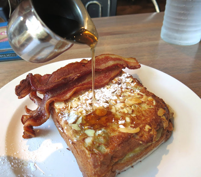 Next, they shared a plate of Maritozzi con la Panna, an Italian style French toast, coated with almonds and stuffed with a banana, mascarpone cream and served with a side of bacon. Brandy thought the flavor of the toast was spot on, with a decent custard like interior to it and a wonderful crunch from the almond coating. The banana helped quite a bit to break through the sweetness and egginess, while the bacon served as a salty palate cleanser between sugary bites.