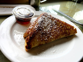 The menu boasted an interesting mix of American staples and traditional Austrian fair.  Though Brandy was eyeing up one of the house specialties (the Chicken Schnitzel in particular) the lure of breakfast foods was too great.  She started off with a small order of French Toast, which came served with maple syrup and powdered sugar(which the waitress kindly informed her was one slice of bread, cut in half.  "That should be perfect, dear," Brandy answered, "I only want a little bit of sweetness for now.").  This was quite simply French toast done right; no fancy flavorings or toppings, just soft, eggy bread with a very thin caramelized crust, a hint of sweetness from the sugar. and a buttery finish.